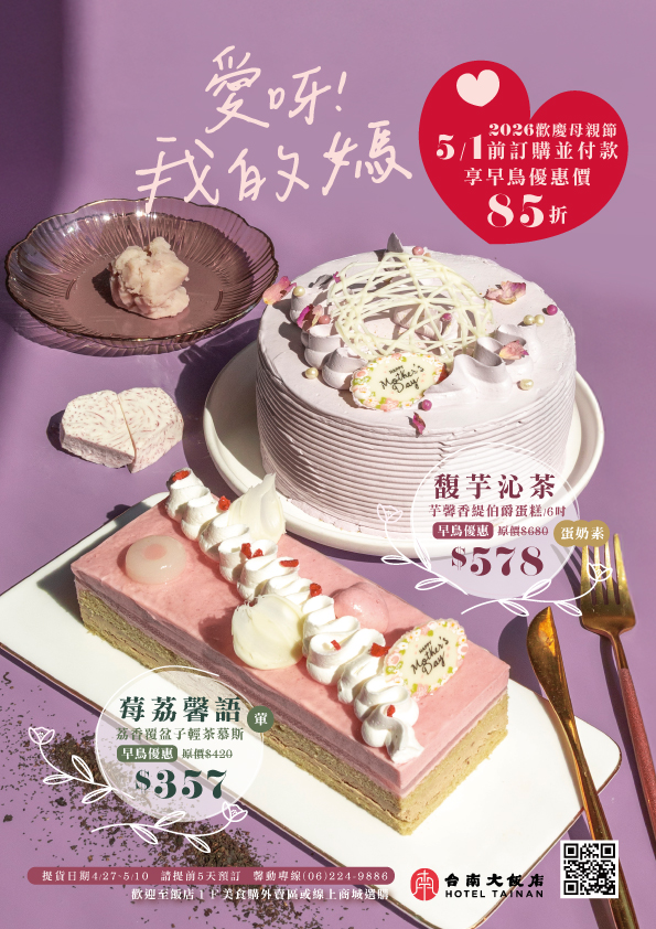 ˙特色亮點: 推出年度限定口味「馥芋沁茶(芋馨香緹伯爵)」與「莓荔馨語(荔香覆盆子輕茶慕斯)」母親節蛋糕。凡預訂中式桌宴,還可享有專屬加購優惠。