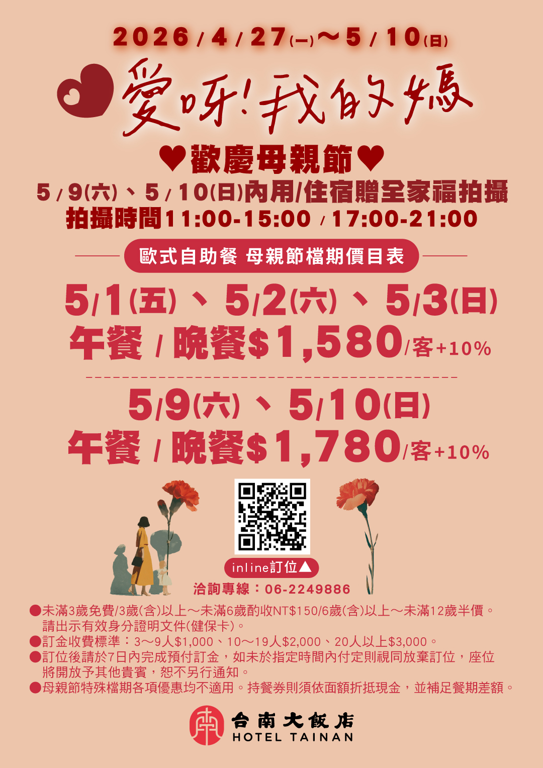 溫馨的五月即將到來,台南大飯店誠摯邀請您與家人共度專屬的母親節時光。今年我們特別準備了豐富的餐飲選擇與全家福拍照活動,讓您輕鬆安排,完美寵愛媽咪