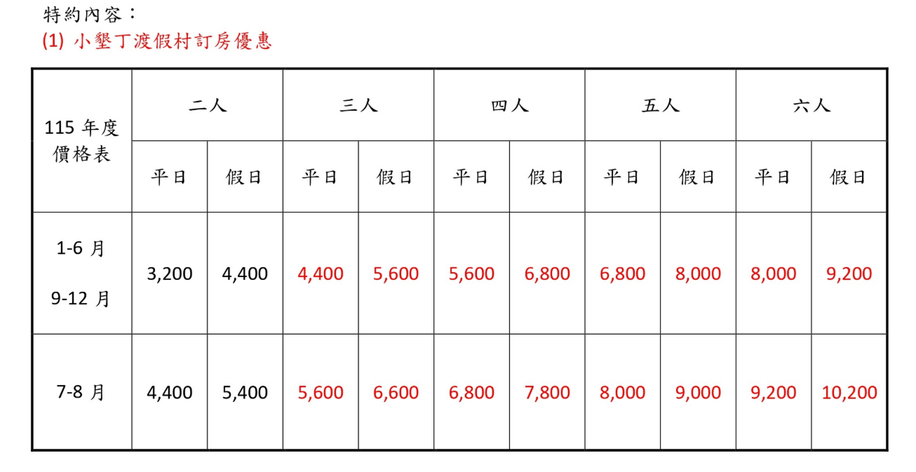 一~六月份、九~十二月份,平日$3,200元,週六假日每房加收$1,200元/天。