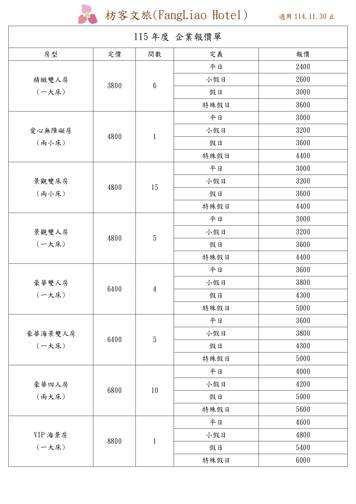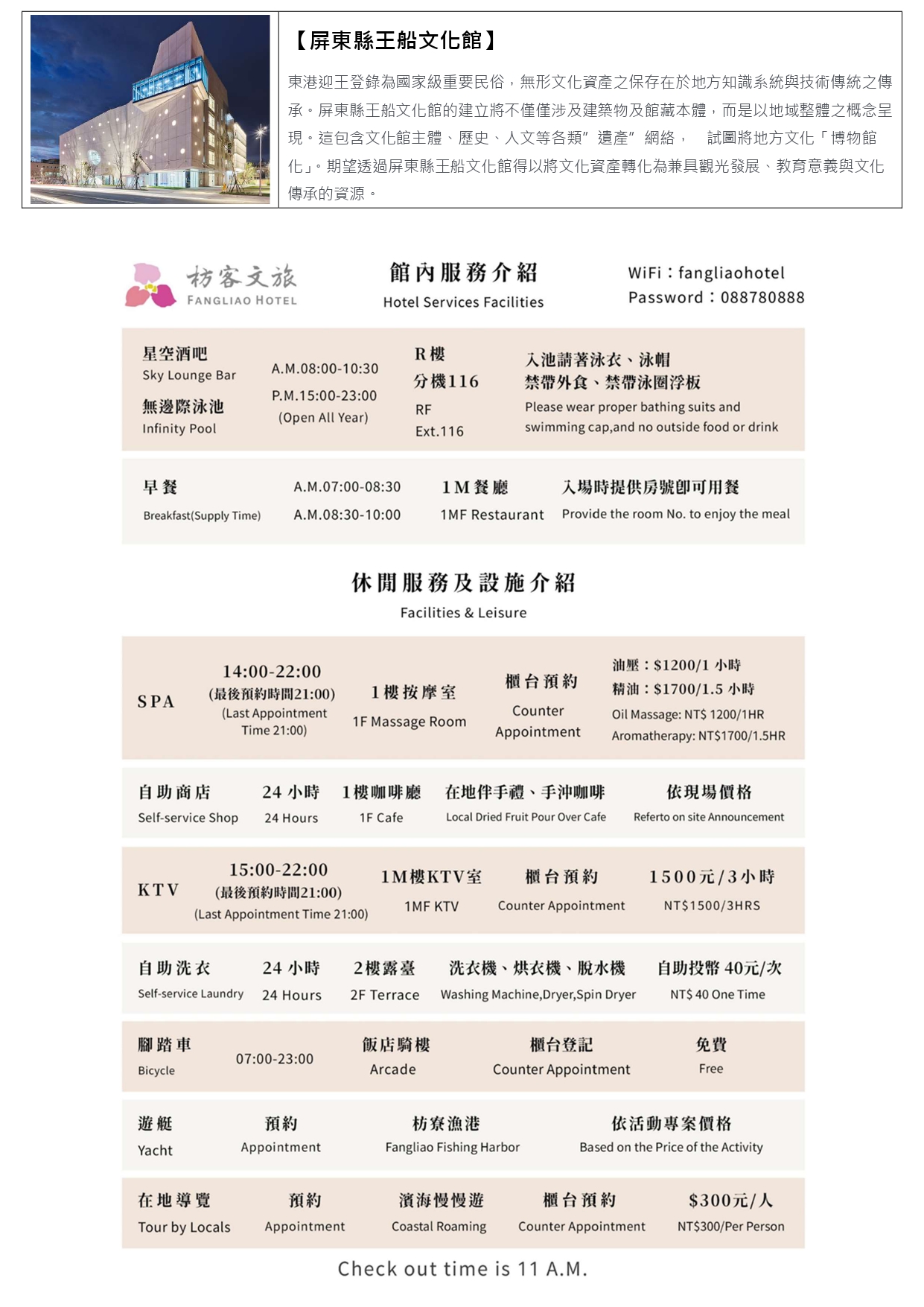 【屏東縣教師職業工會會員福利】枋客文旅(FangLiao Hotel) ★優惠期限至115年12月31日止。 ★會員訂房須以【屏東縣教師職業工會會員卡】訂房,並告知企業統編(36774133)及企業合約編號(A0070)方能享有優惠方案。 ★枋客文旅官方網站: https://www.fangliaohotel.com.tw/ ★連絡電話: TEL:08-878-0888 FAX:08-878-0838 LINE:@fangliaohotel