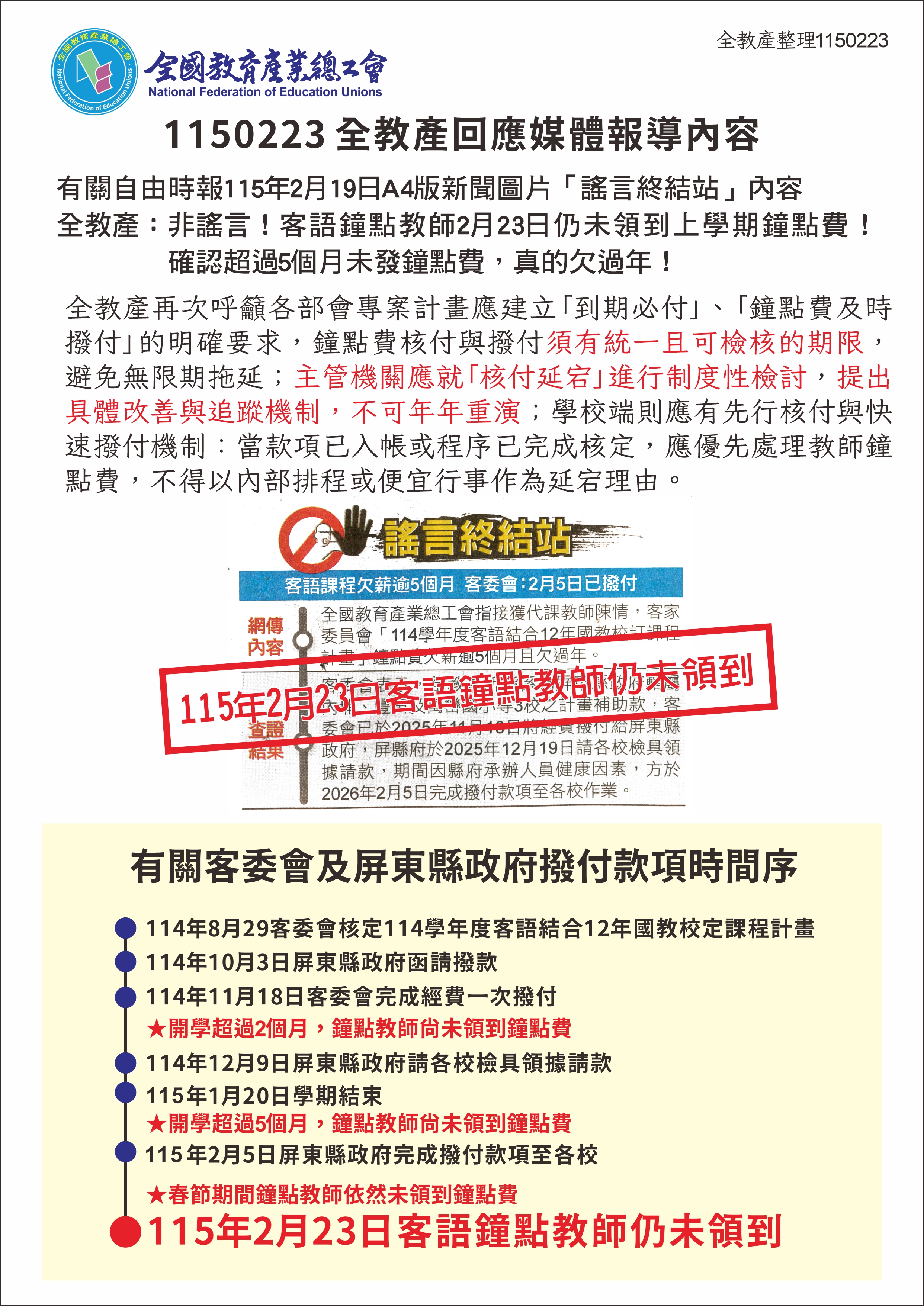 有關自由時報115年2月19日A4版新聞圖片「謠言終結站」內容,經全教產今日再次確認,鐘點教師今天仍然未領到上學期的鐘點費,至此確認鐘點費真的欠過年!並非謠言!