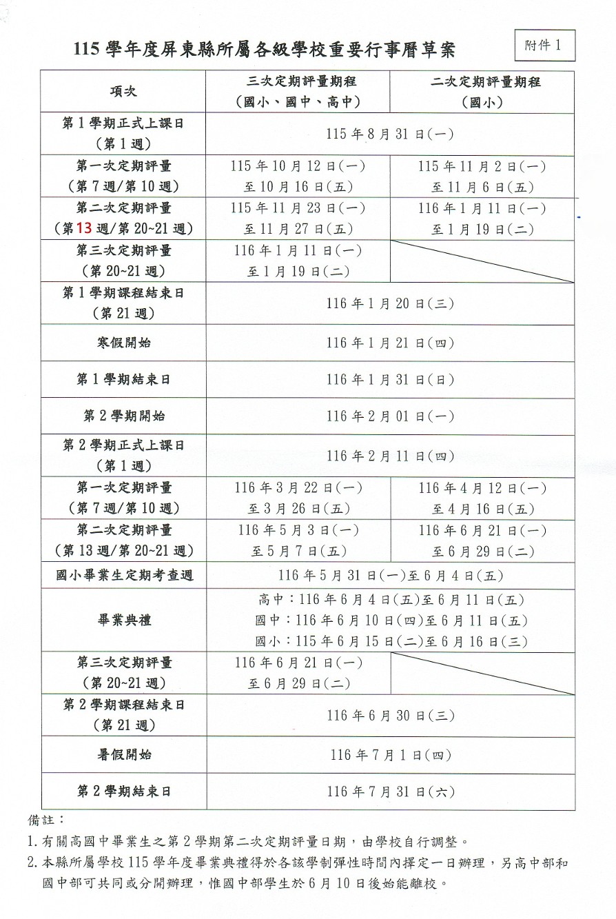 四、 檢附115學年度屏東縣所屬各級學校重要行事曆草案1份,請各與會學校代表協助檢視各項時間之適切性。