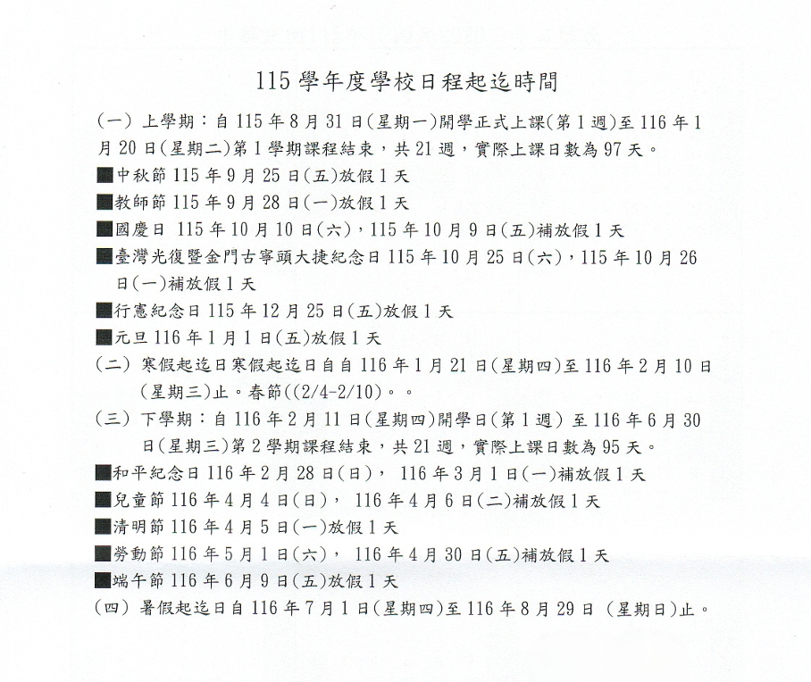 一、115學年度第1學期開學日為115年8月31日(星期一),第2學期開學日為116年2月11日(星期四)。